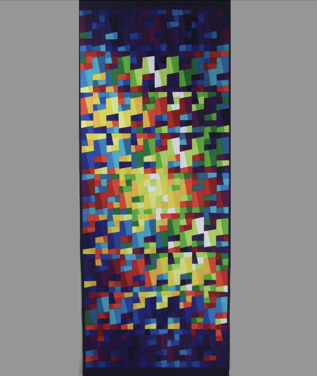 First showings is a response to a prayer/poem by John Philip Newell. Inspired by the author's description of dawn, it is designed to allow a back light to bring the colours to life – to blur the boundaries between textile art and stained glass.